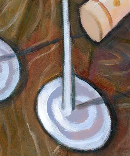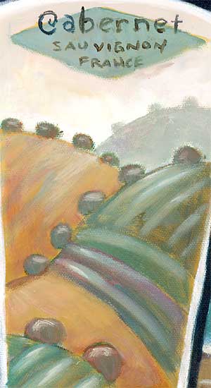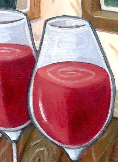 | "Cabernet Sauvignon and Two Glasses on a Table" by Charles Kaufman 19.8 x 39.6 inches Acrylic paints on canvas. 50 x 100 cm |