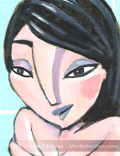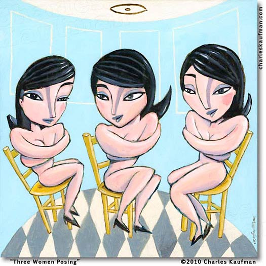 | "Three Women Posing" by Charles Kaufman 39.6 x 39.6 inches Note: This is a little different style of painting for me. It is more graphic in design with a simpler background. |